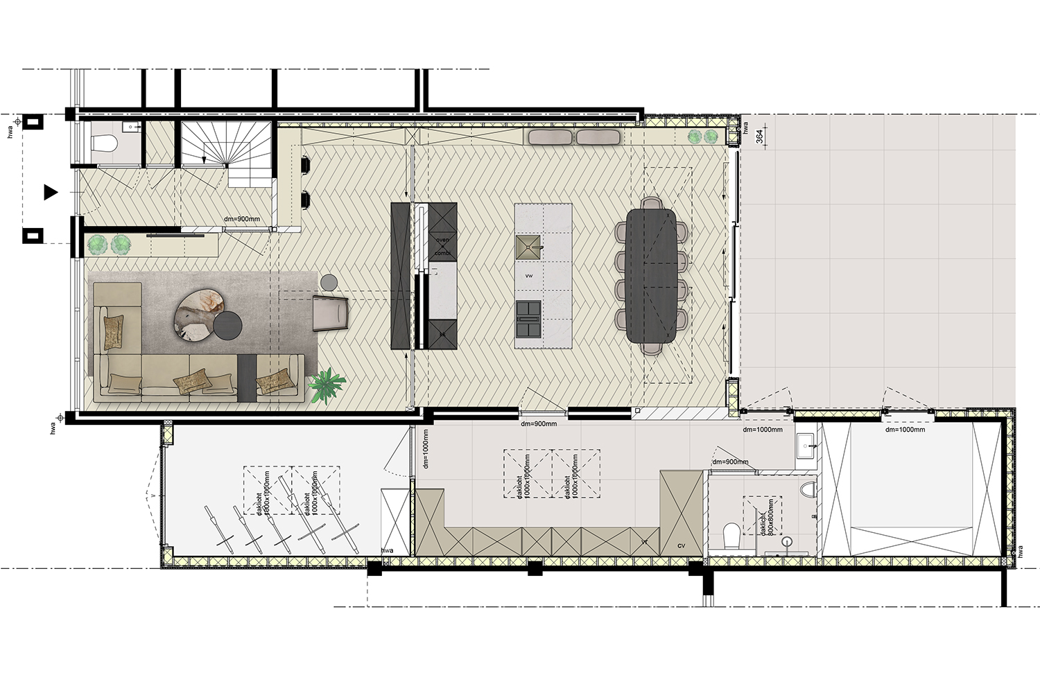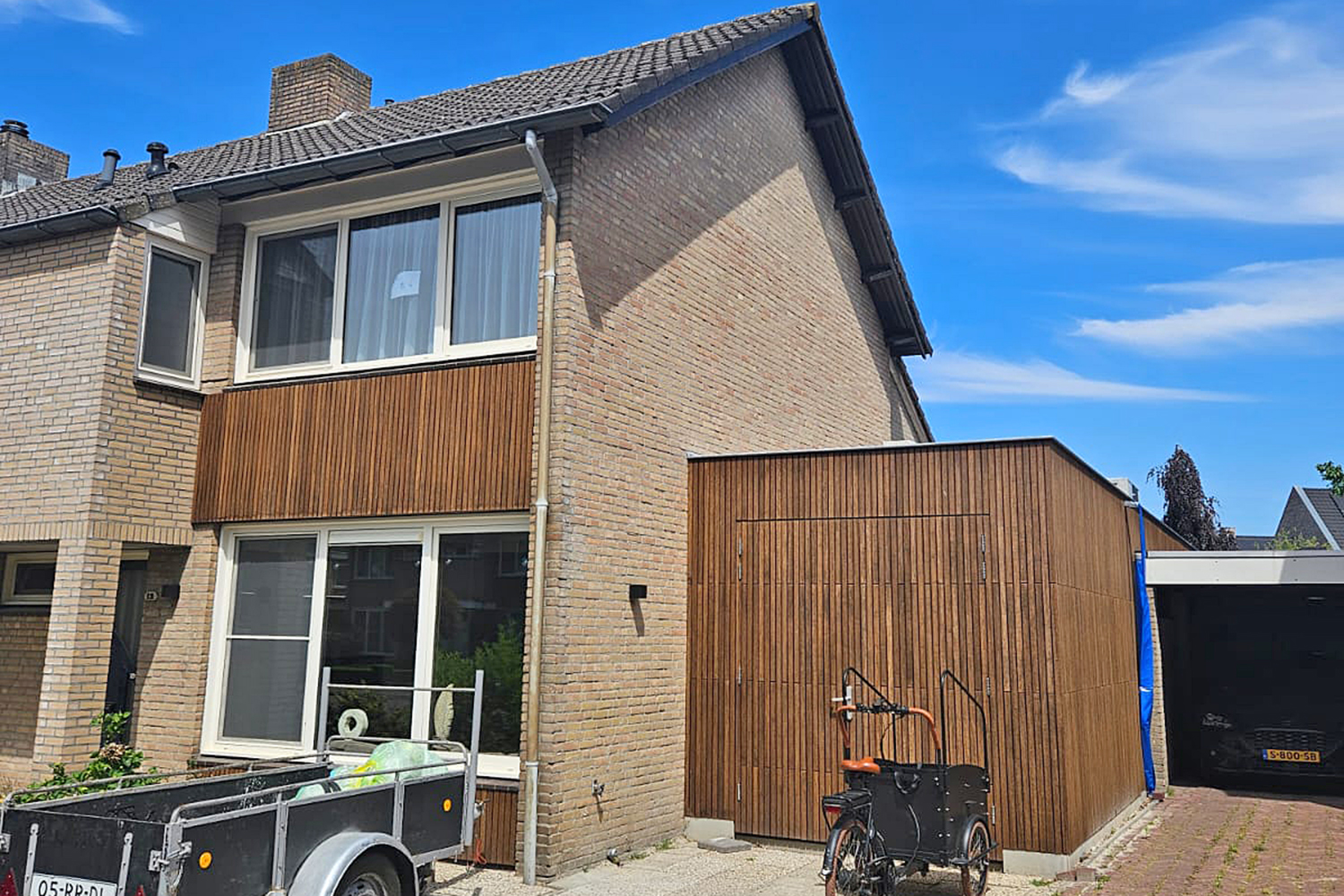 De bestaande carport werd volledig opgenomen in de woning en kreeg een nieuwe functie als fietsenstalling, bijkeuken, tweede toilet, badkamer en opbergruimte. Een wens van de bewoners die zo efficiënt en stijlvol is ingepast dat het voelt alsof het altijd zo is geweest.