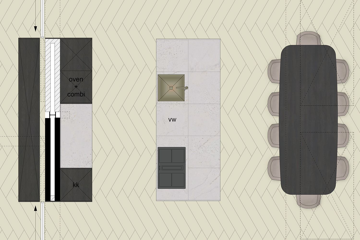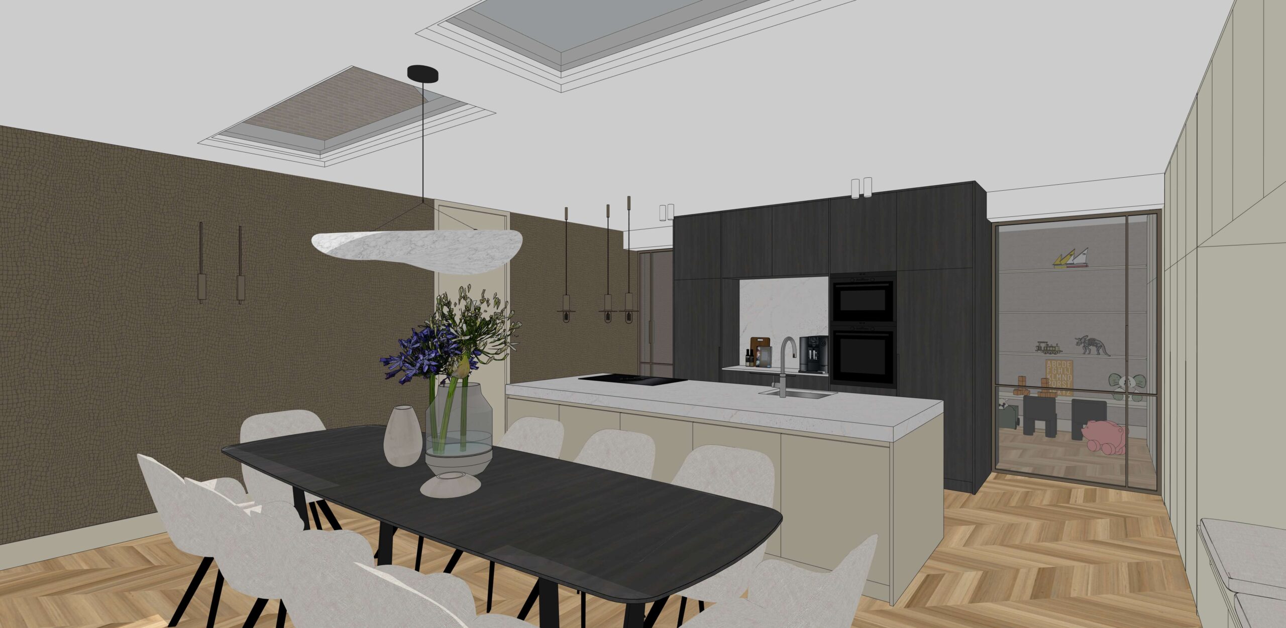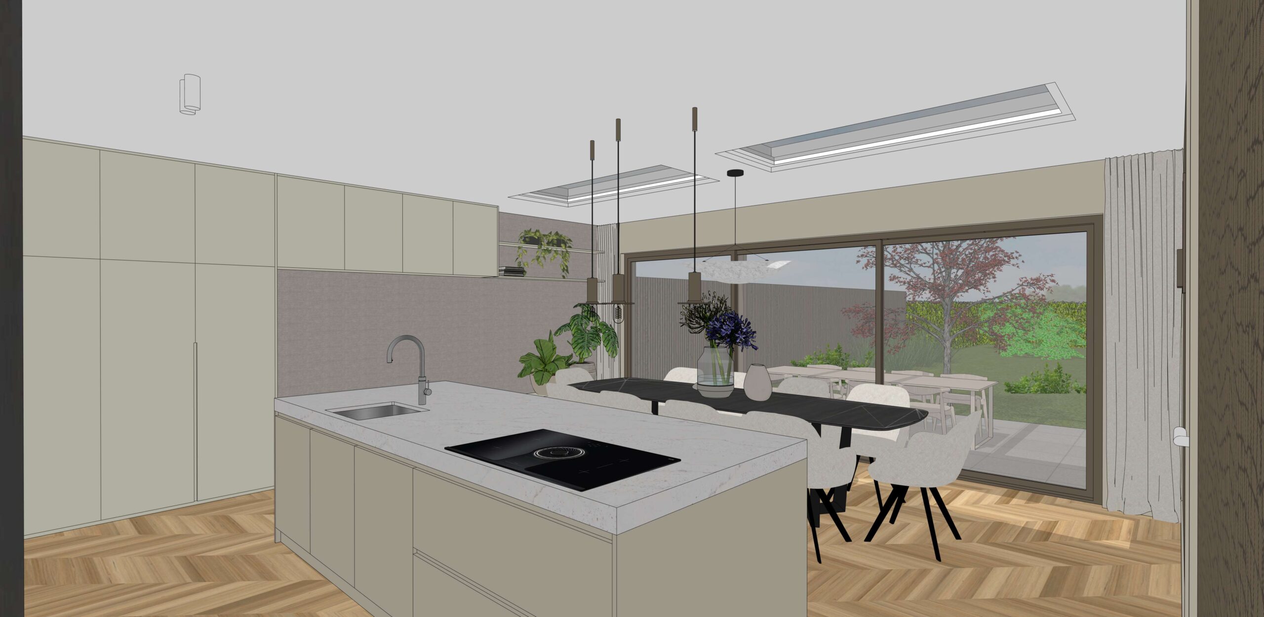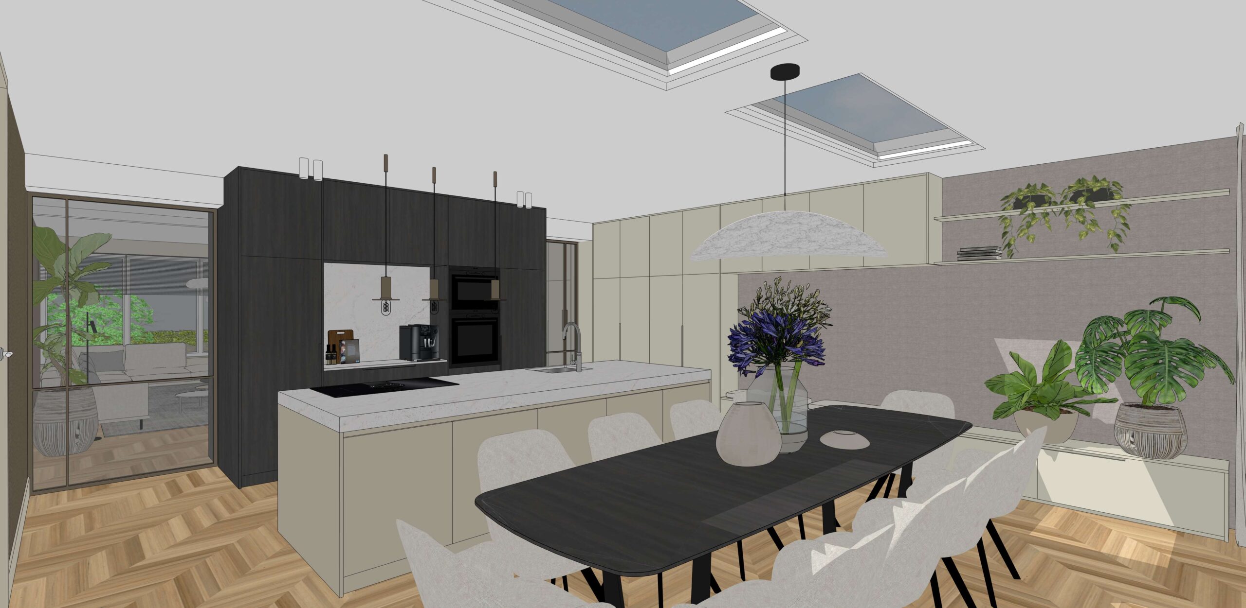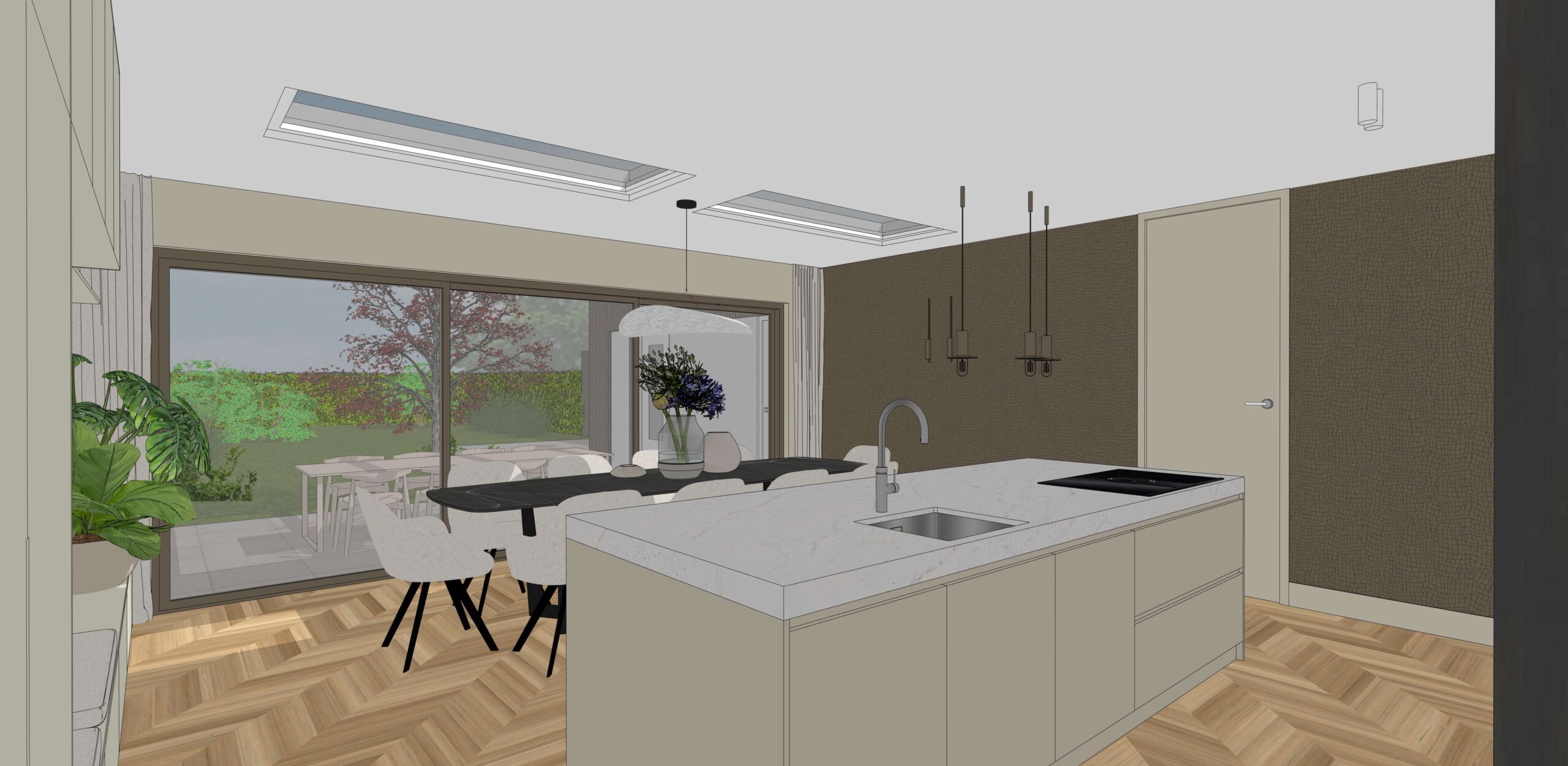 Deze oplossing bleek de perfecte match: de keuken kreeg de royale opstelling waar ze van droomden, de zithoek werd ruimer én er ontstond plek voor een aparte speelruimte, mooi geïntegreerd in de plattegrond.