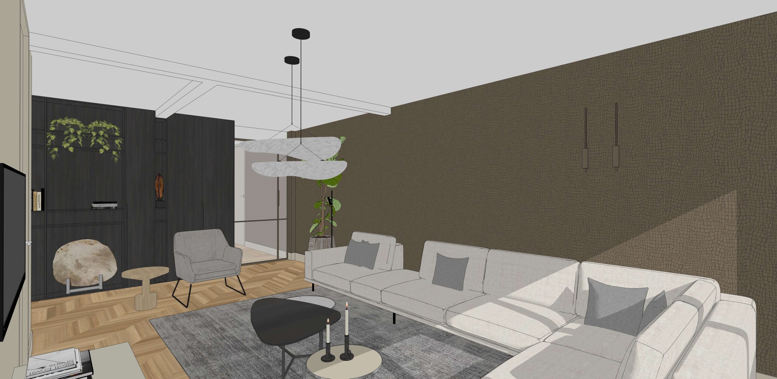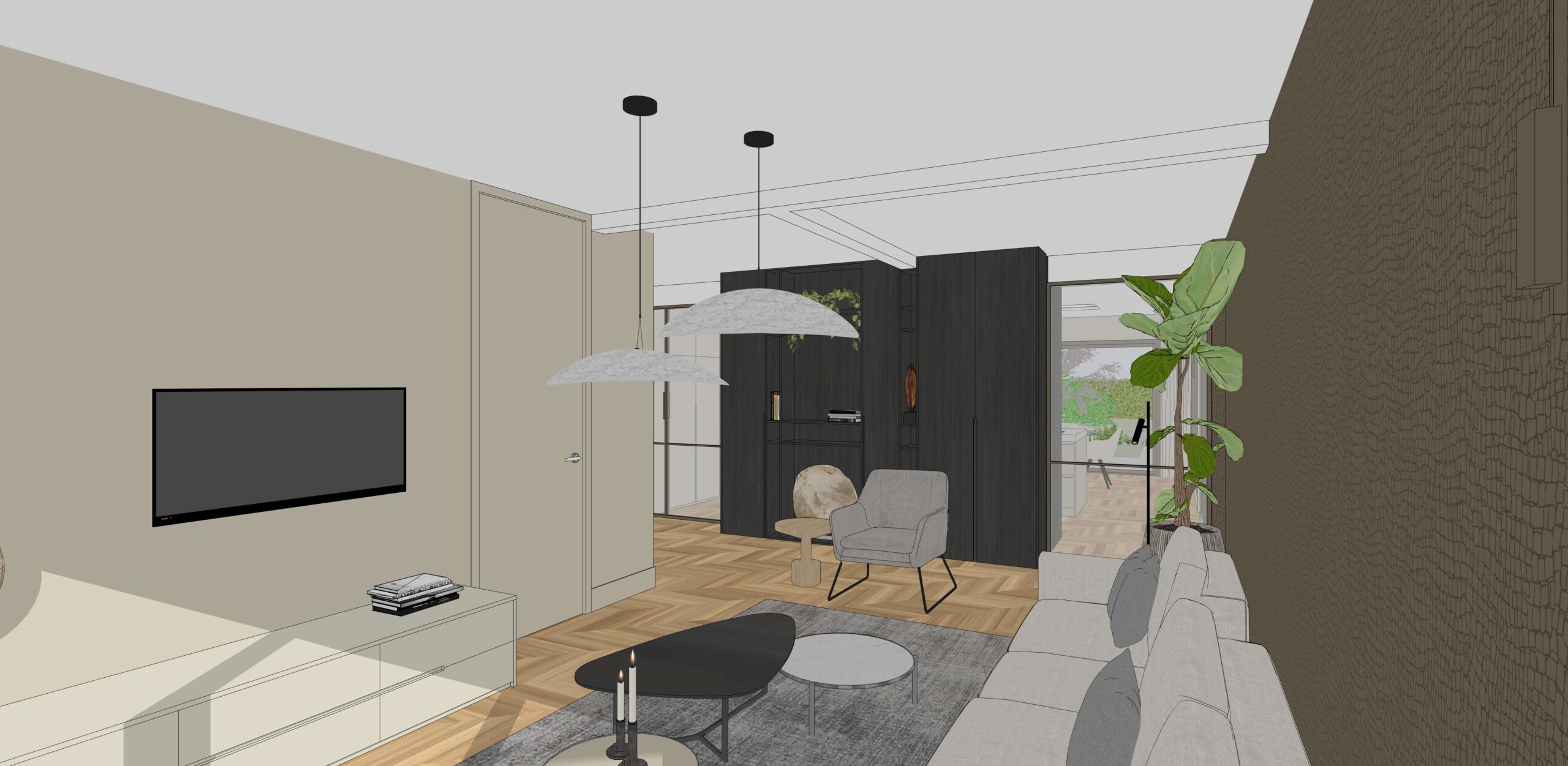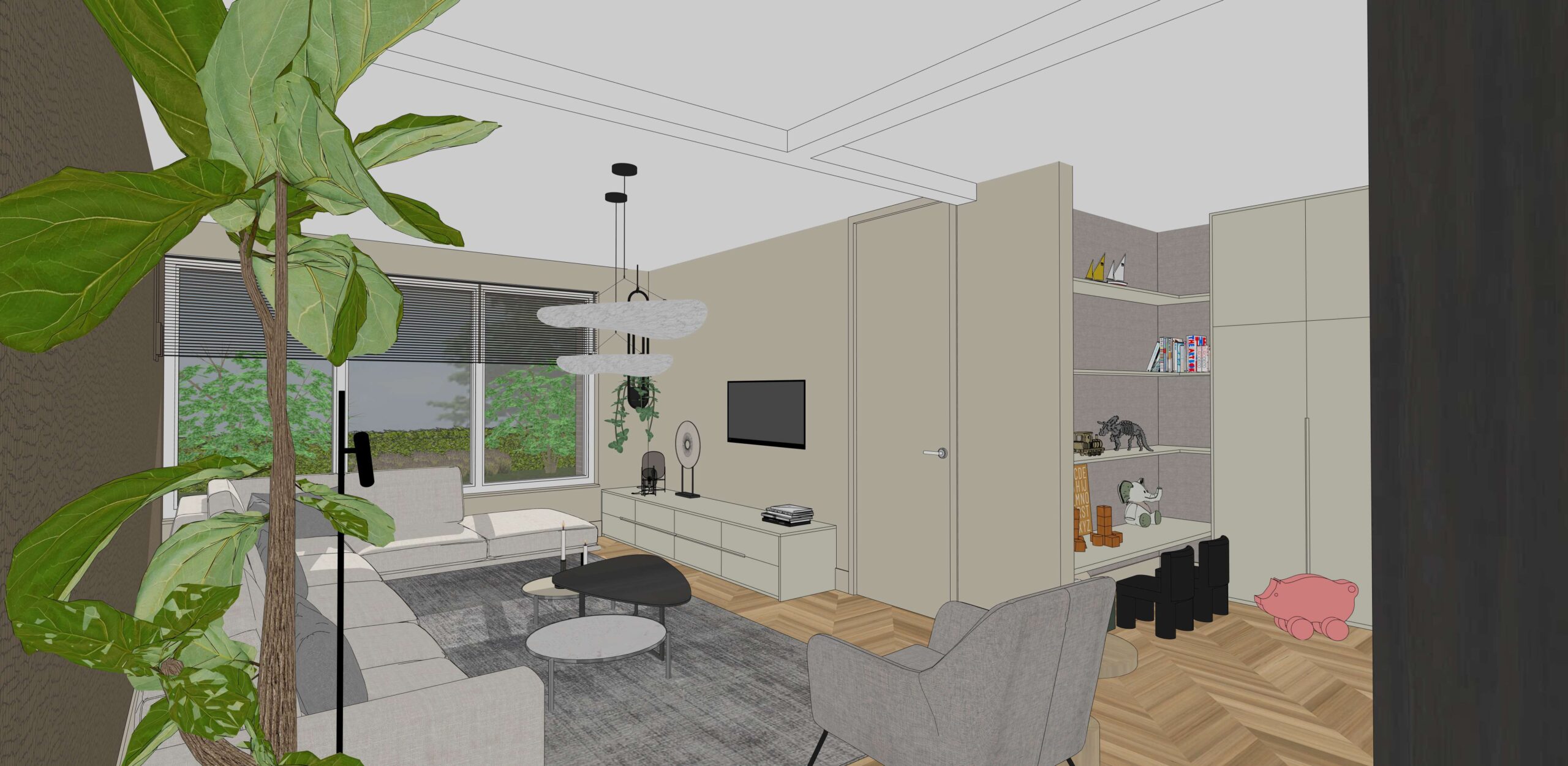 Voor een jong gezin in Gemert ontwierp ik een compleet nieuwe indeling van de begane grond van hun twee-onder-een-kapwoning. Ze kwamen bij me met een heldere wensenlijst én een realistisch budget: een ruimere zitkamer, een speelruimte voor de kinderen, een royale leefkeuken én het benutten van de carport als functionele uitbreiding.